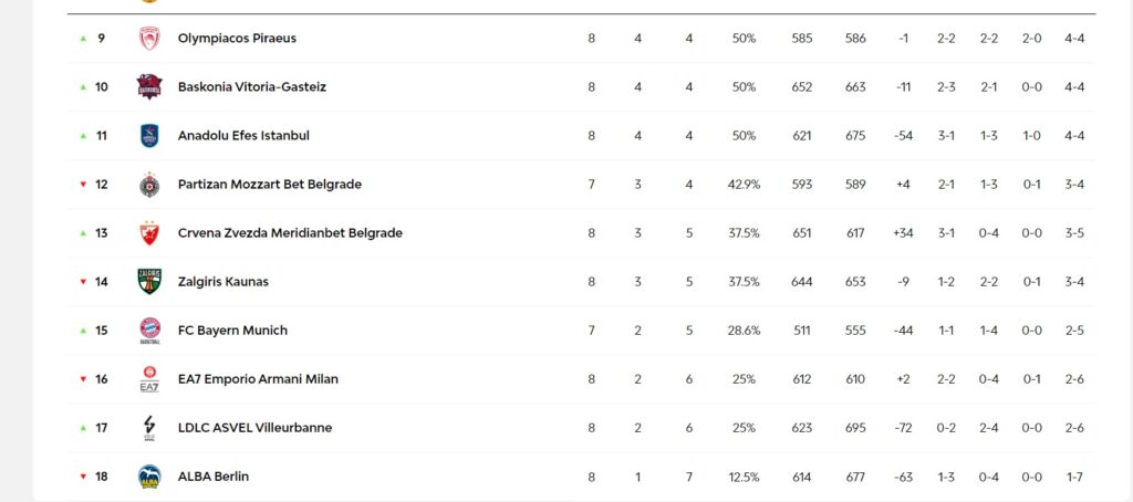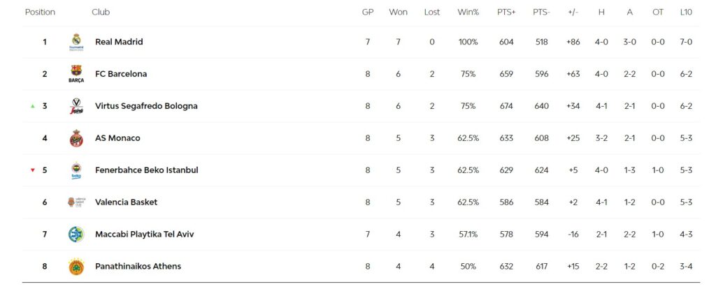 Ο Παναθηναϊκός συνεχίζει να βρίσκεται στην όγδοη θέση της κατάταξης της Euroleague φτάνοντας το ρεκόρ του στο 4-4.