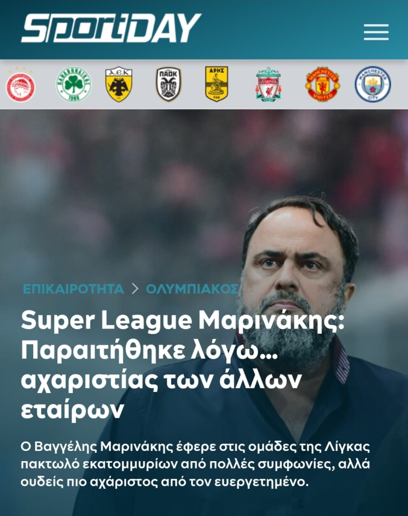 Ως δείγμα αχαριστίας εξέλαβε η ηλεκτρονική μορφή της εφημερίδας Sportday τον εξαναγκασμό του Βαγγέλη Μαρινάκη σε παραίτηση από την προεδρία της Superleague!