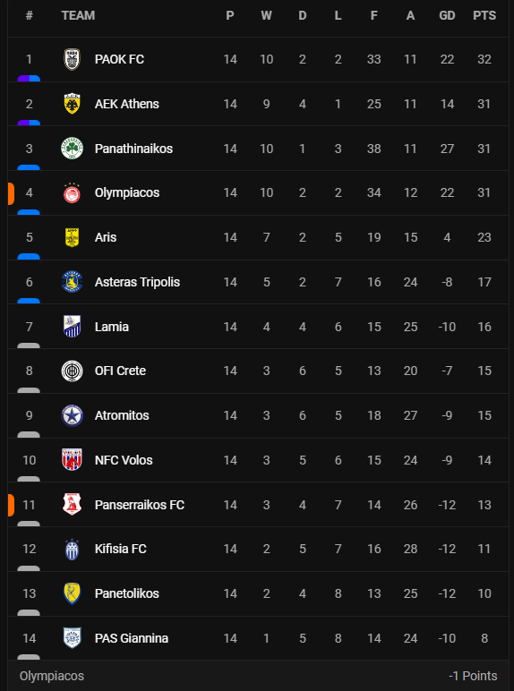 Μετά την ισοπαλία της ΑΕΚ στο Αγρίνιο με τον Παναιτωλικό και την νίκη του Ολυμπιακού επί του Πανσερραϊκού, o Παναθηναϊκός βρίσκεται την τρίτη θέση με 31 βαθμούς και ισοβαθμεί μαζί τους. Πρωτοπόρος είναι ο ΠΑΟΚ, ο οποίος έχει έναν βαθμό παραπάνω.