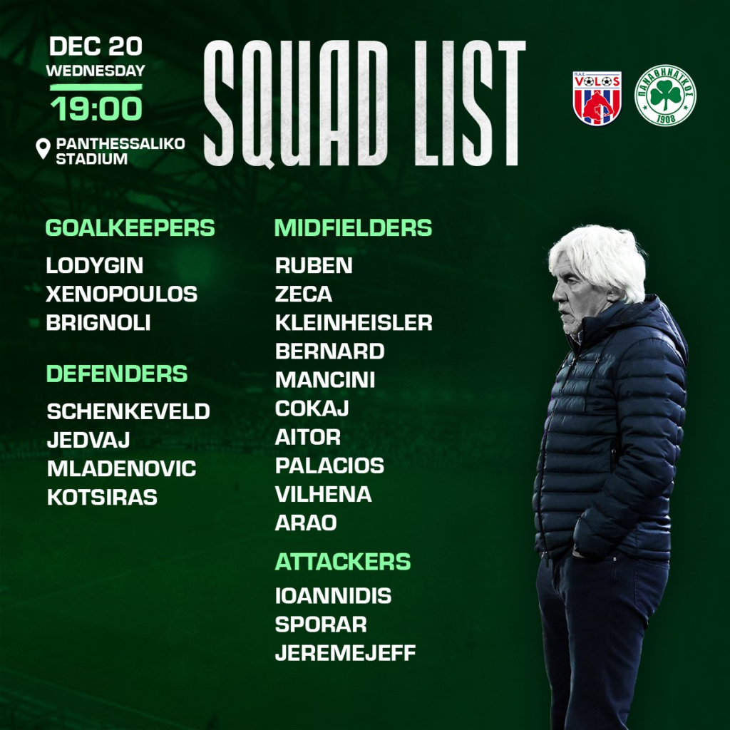 Χωρίς τους Χουάνκαρ, Βαγιαννίδη, Τζούρισιτς, Βέρμπιτς και Τσέριν θα ταξιδέψει ο Παναθηναϊκός στο Βόλο για το ματς με την ομώνυμη ομάδα.