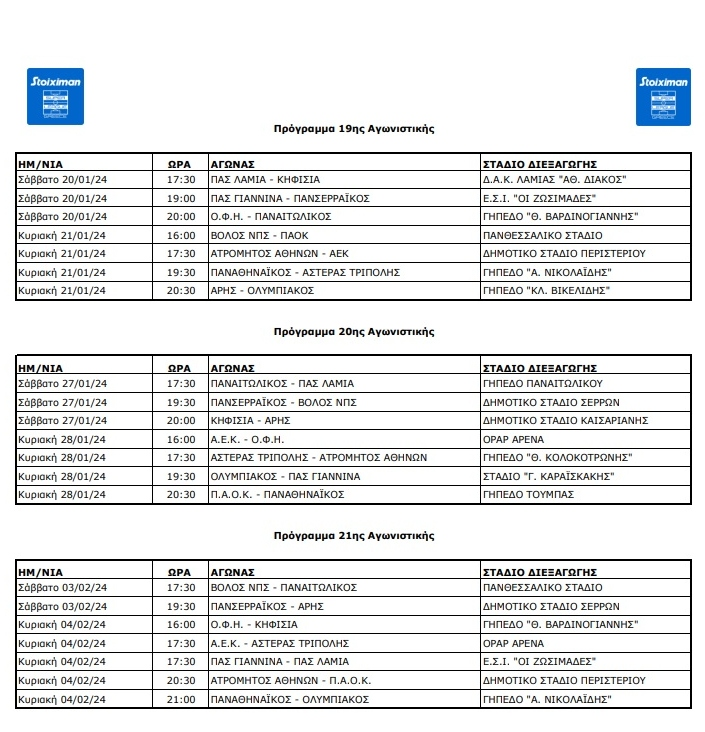 Η Superleague έκανε γνωστές τις ημέρες και τις ώρες των αγώνων του πρωταθλήματος από την 19η μέχρι και την 21η αγωνιστική.