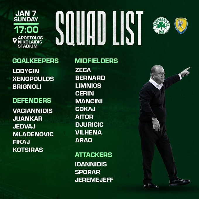 Παράλληλα ντεμπούτο στην αποστολή της ομάδας θα κάνει ο Δημήτρης Λημνιός ενώ από την λίστα λείπουν οι Βέρμπιτς και Πέρεθ, οι οποίοι εκτίουν ποινή λόγω καρτών.