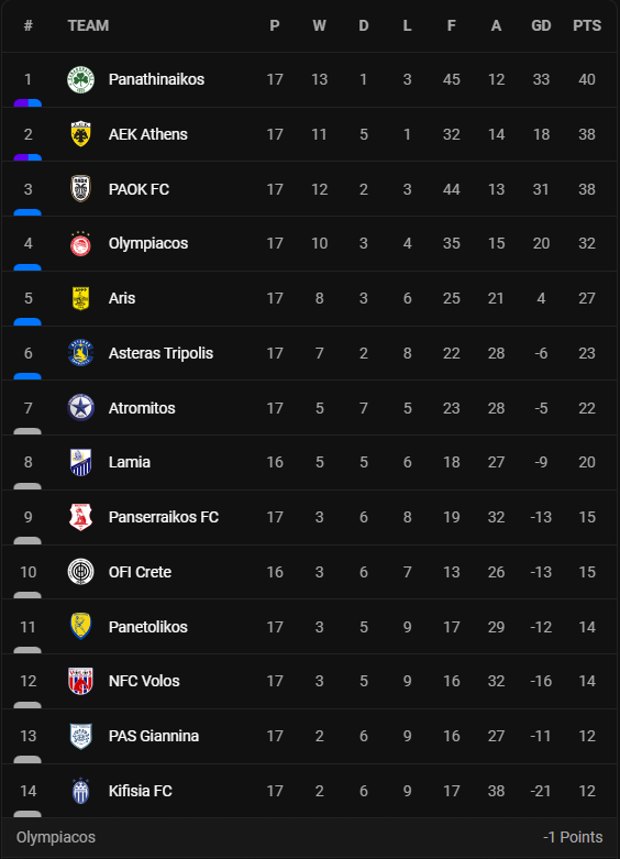 Μετά τη νίκη του Παναθηναϊκού και την ήττα του ΠΑΟΚ από τον Άρη, οι πράσινοι βρίσκονται στην κορυφή της βαθμολογίας με 40 βαθμούς έχοντας στο -2 τους ΠΑΟΚ και ΑΕΚ. Ο Ολυμπιακός βρίσκεται στο -8 από την κορυφή μετά την νίκη των κιτρινόμαυρων στο Φάληρο