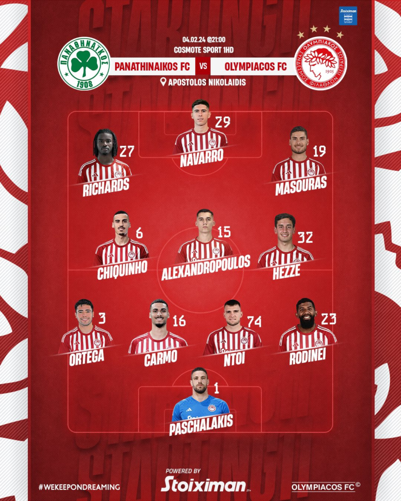 Με συνταγή Κυπέλλου Ελλάδος έρχεται στην Λεωφόρο ο Ολυμπιακός καθώς θέση βασικού παίρνουν οι Ρίτσαρντς, Τσικίνιο και την ίδια στιγμή στον πάγκο θα βρίσκονται οι Φορτούνης, Ποντένσε.