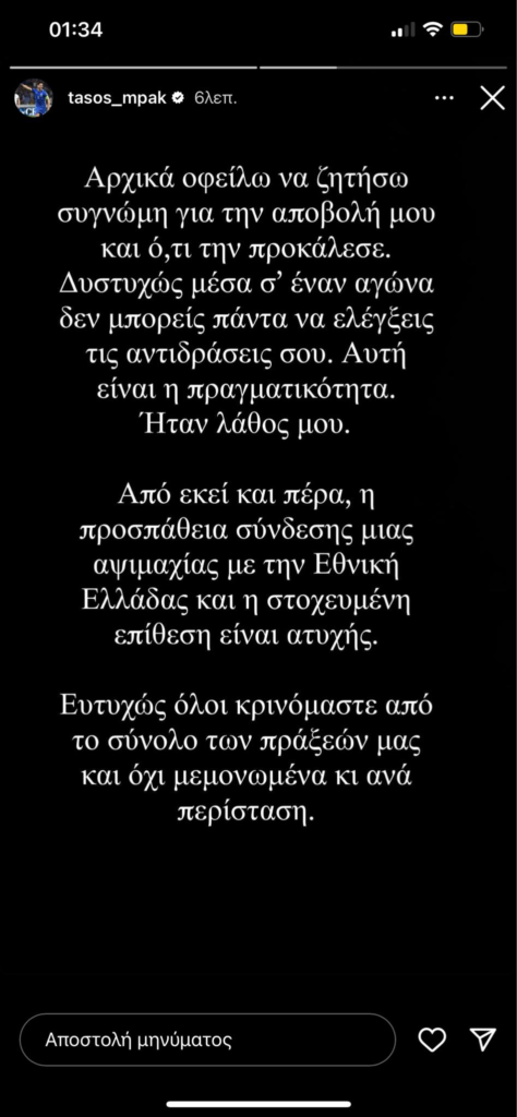 Ο Τάσος Μπακασέτας απολογήθηκε μέσω Instagram για την αποβολή του στο ματς με τον ΠΑΟΚ και παράλληλα απάντησε στους Θεσσαλονικείς για τα όσα είπαν για τον ίδιο και το γεγονός πως είναι αρχηγός της Εθνικής ομάδας.