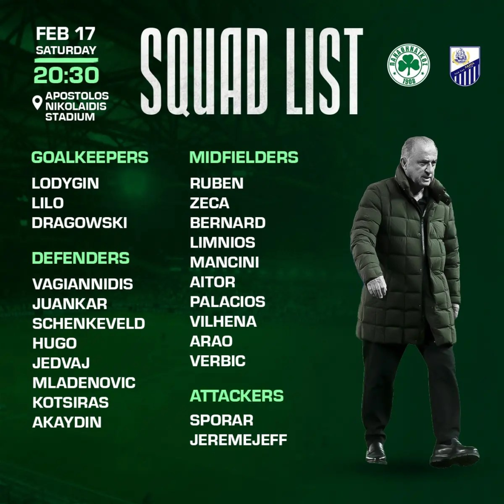 Μετά το τέλος της προπόνησης ο Φατίχ Τερίμ ανακοίνωσε την αποστολή για τον αγώνα. Σε αυτή βρίσκονται οι Λοντίγκιν, Ντραγκόφσκι, Λίλο, Βαγιαννίδης, Χουάνκαρ, Ρουμπέν, Σένκεφελντ, Ζέκα, Σπόραρ, Μπερνάρ, Λημνιός, Μαντσίνι, Ούγκο, Γεντβάι, Αϊτόρ, Μλαντένοβιτς, Κώτσιρας, Γερεμέγεφ, Παλάσιος, Βιλένα, Αράο, Βέρμπιτς, Ακαϊντίν.