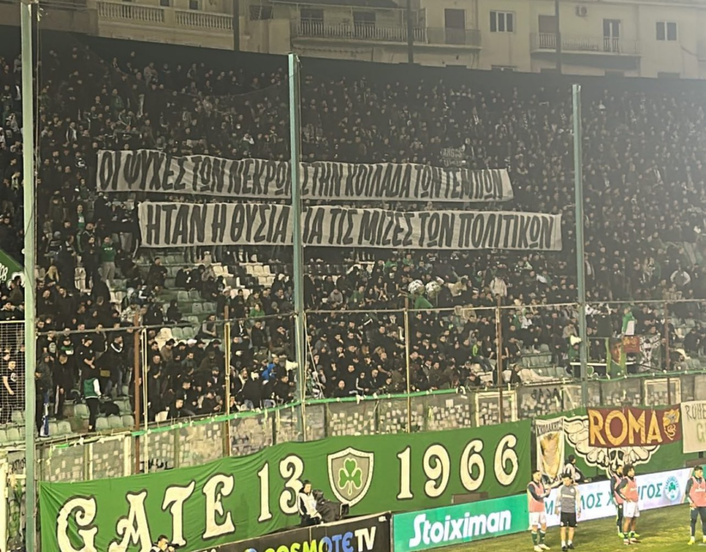 Η Θύρα 13 τίμησε την μνήμη των 57 νεκρών της τραγωδίας των Τεμπών σηκώνοντας πανό στο δεύτερο ημίχρονο της αναμέτρησης με τον ΟΦΗ.