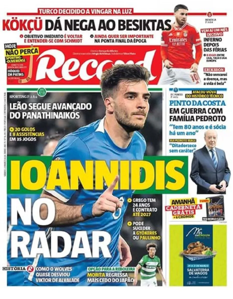 Ο Φώτης Ιωαννίδης αποτελεί κεντρικό θέμα της πορτογαλικής εφημερίδας Record. Οι Πορτογάλοι υποστηρίζουν πως η Σπόρτινγκ Λισαβόνας τσεκάρει τον Έλληνα διεθνή του Παναθηναϊκού προκειμένου να αντικαταστήσει τον Βίκτορ Γκιοκέρες για τον οποίο η Άρσεναλ δίνει “γη και ύδωρ”.