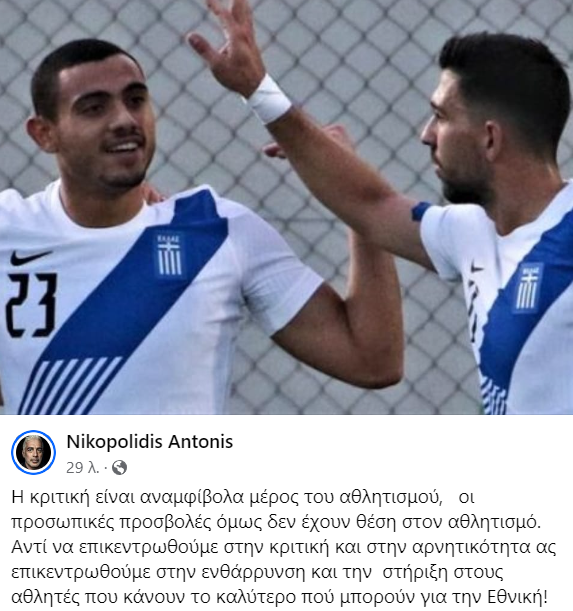 “Η κριτική είναι αναμφίβολα μέρος του αθλητισμού, οι προσωπικές προσβολές όμως δεν έχουν θέση στον αθλητισμό. Αντί να επικεντρωθούμε στην κριτική και στην αρνητικότητα ας επικεντρωθούμε στην ενθάρρυνση και την στήριξη στους αθλητές που κάνουν το καλύτερο πού μπορούν για την Εθνική!”