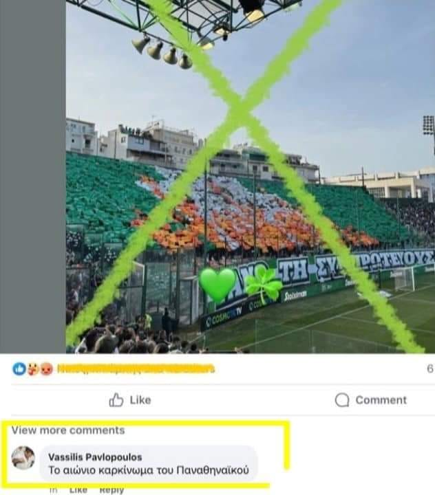 Με σχόλιο του στο Facebook, ο νομικός σύμβουλος και γενικός γραμματέας του Ερασιτέχνη Παναθηναϊκού χαρακτηρίζει ως αιώνιο καρκίνωμα την Θύρα 13 εξαιτίας του κορεό που έγινε στο ματς με τον ΠΑΟΚ.