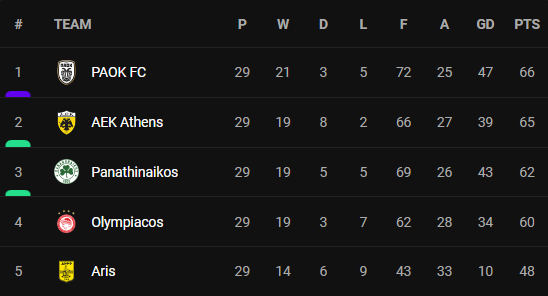 Κερδίζοντας την ΑΕΚ ο Παναθηναϊκός μείωσε τη διαφορά που είχε από τους κιτρινόμαυρους στους τρεις βαθμούς και μένει στο κυνήγι του ΠΑΟΚ φτάνοντας στους 62 βαθμούς.