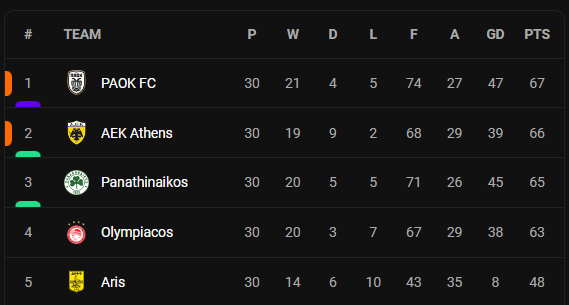 Μετά το διπλό του Παναθηναϊκού στο Χαριλάου και την ισοπαλία μεταξύ ΑΕΚ και ΠΑΟΚ στην Νέα Φιλαδέλφεια οι πράσινοι βρίσκονται σε απόσταση αναπνοής από την κορυφή μειώνοντας στο -2 από τους Θεσσαλονικείς και -1 από την ΑΕΚ