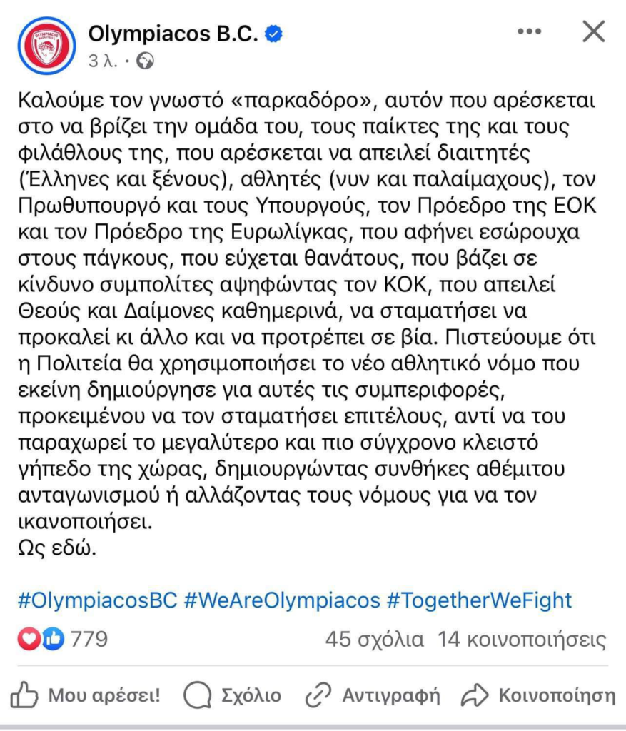 «Καλούμε τον γνωστό «παρκαδόρο», αυτόν που αρέσκεται στο να βρίζει την ομάδα του, τους παίκτες της και τους φιλάθλους της, που αρέσκεται να απειλεί διαιτητές (Έλληνες και ξένους), αθλητές (νυν και παλαίμαχους), τον Πρωθυπουργό και τους Υπουργούς, τον Πρόεδρο της ΕΟΚ και τον Πρόεδρο της Ευρωλίγκας, που αφήνει εσώρουχα στους πάγκους, που εύχεται θανάτους, που βάζει σε κίνδυνο συμπολίτες αψηφώντας τον ΚΟΚ, που απειλεί Θεούς και Δαίμονες καθημερινά, να σταματήσει να προκαλεί κι άλλο και να προτρέπει σε βία.