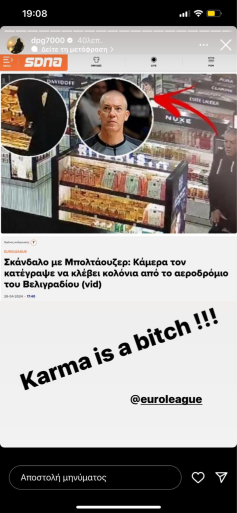 O διαιτητής του Game 1 ανάμεσα σε Παναθηναϊκό και Μακάμπι, Μπολτάουζερ, πιάστηκε από κάμερα να κλέβει κολόνια από το αεροδρόμιο του Βελιγραδίου και αυτό δεν έμεινε ασχολίαστο από τον μεγαλομέτοχο της ΚΑΕ.