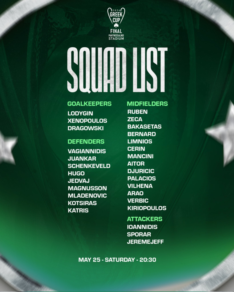 Μετά το τέλος της προπόνησης ο Χρήστος Κόντης ανακοίνωσε την αποστολή που θα βρεθεί από σήμερα, Πέμπτη, στο Βόλο. Στη λίστα βρίσκονται οι Λοντίγκιν, Ντραγκόφσκι, Ξενόπουλος, Βαγιαννίδης, Χουάνκαρ, Ρουμπέν, Σένκεφελντ, Ζέκα, Ιωαννίδης, Μπακασέτας, Σπόραρ, Μπερνάρ, Λημνιός, Τσέριν, Μαντσίνι, Ούγκο, Γεντβάι, Αϊτόρ, Μάγκνουσον, Μλαντένοβιτς, Κώτσιρας, Γερεμέγεφ, Τζούριτσιτς, Παλάσιος, Βιλένα, Αράο, Βέρμπιτς, Κυριόπουλος, Κάτρης.