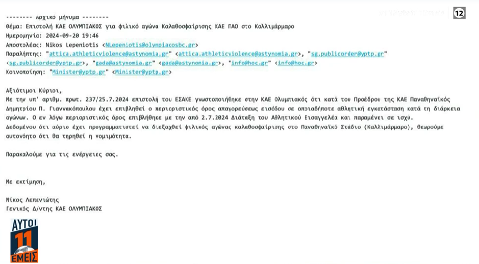 Η εκπομπή «11 αυτοί 11 εμείς» στο «OPEN» δημοσίευσε επιστολή της ΚΑΕ Ολυμπιακός προς τις αρχές αναφορικά με την παρουσία του ισχυρού άνδρα της «πράσινης» ΚΑΕ στο Καλλιμάρμαρο για το τουρνουά “Παύλος Γιαννακόπουλος”.