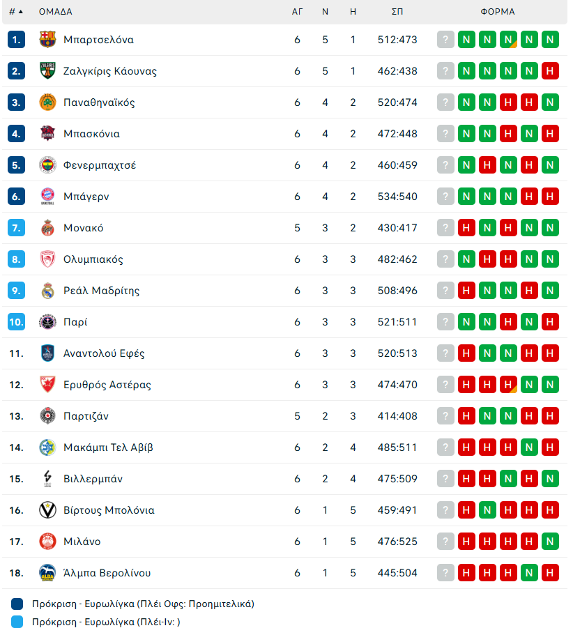 Ο Παναθηναϊκός βρίσκεται στην τρίτη θέση της regular season της Euroleague μετά το πέρας έξι αγωνιστικών και σκορ 4-2.