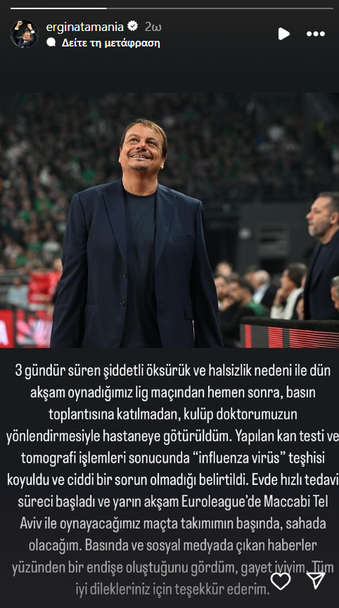 Η άμεση θεραπεία ξεκίνησε στο σπίτι και θα είμαι στον πάγκο της ομάδας μου στον επόμενο αγώνα στην EuroLeague κόντρα στην Μακάμπι Τελ Αβίβ, αύριο το βράδυ. Είδα ότι υπήρξε ανησυχία στα ΜΜΕ και στα social media. Είμαι καλά, σας ευχαριστώ για τις ευχές σας».
