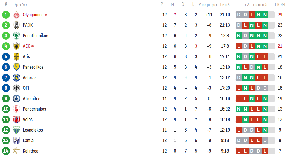 Μετά τη νίκη του επί του Παναιτωλικού στο Αγρίνιο, ο Παναθηναϊκός έφτασε στους 22 βαθμούς και προσπέρασε την ΑΕΚ και τον Άρη ανεβαίνοντας στην τρίτη θέση.