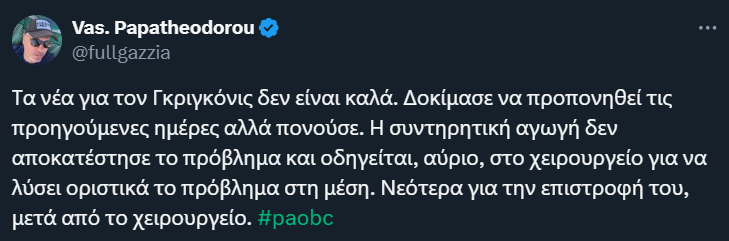 Σύμφωνα με όσα μετέδωσε ο Θοδωρής Παπαθεοδώρου, ο Μάριους Γκριγκόνις θα οδηγηθεί στο χειρουργείο για να λύσει το πρόβλημα που αντιμετωπίζει στη μέση καθώς η θεραπευτική αγωγή που ακολούθησε δεν απέδωσε.