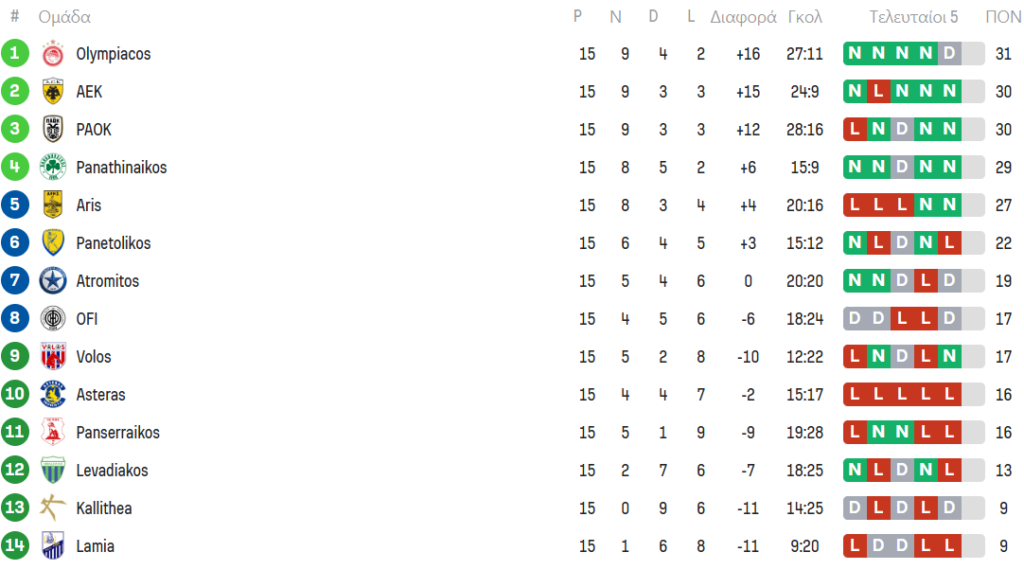 Μετά την ισοπαλία του Ολυμπιακού με την Athens Kallithea, ο Παναθηναϊκός μείωσε τη διαφορά του από την κορυφή στους 2 βαθμούς και παραμένει σταθερά στον 1 βαθμό από ΑΕΚ και ΠΑΟΚ έχοντας 29 πόντους.