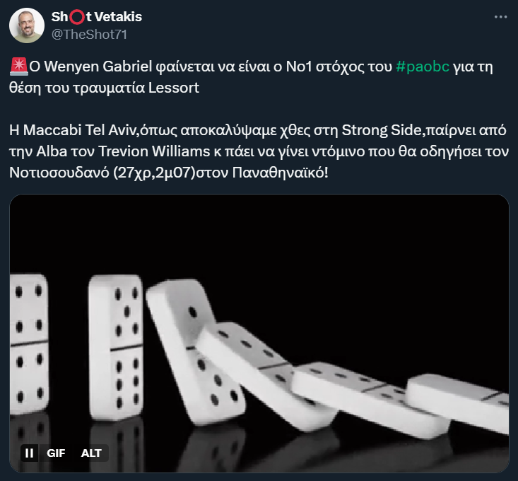 Σύμφωνα με τον Σωτήρη Βετάκη ο Παναθηναϊκός έχει στοχεύσει στην απόκτηση του 27χρονου σέντερ της Μακάμπι Βένιεν Γκαμπριέλ ως αποτέλεσμα ντόμινο καθώς οι Ισραηλινοί είναι κοντά στην απόκτηση του Τρέβιον Γουίλιαμς.