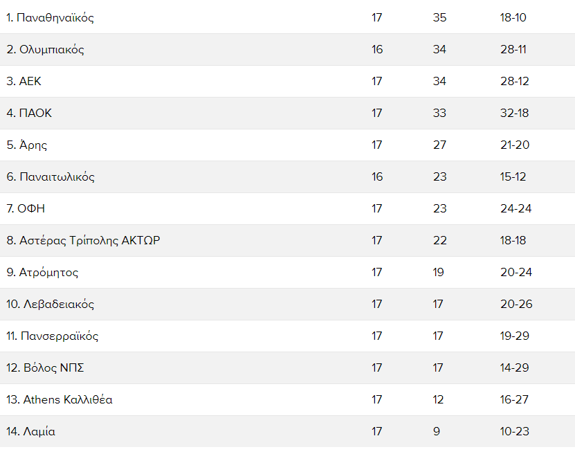 Αναλυτικά η βαθμολογία της Super League μετά τους αγώνες για την 17η αγωνιστική έχει ως εξής: