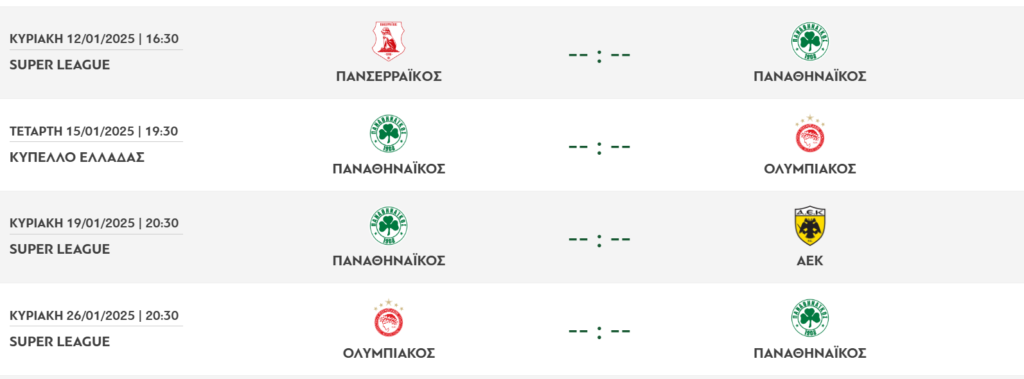 Αρχής γενομένης του ματς με τον Πανσερραϊκό την Κυριακή (12/01 – 16:30) στις Σέρρες, ο Παναθηναϊκός εγκαινιάζει το δύσκολο πρόγραμμα του Ιανουαρίου με απανωτά ντέρμπι ανά τρεις ημέρες με Ολυμπιακό και ΑΕΚ.