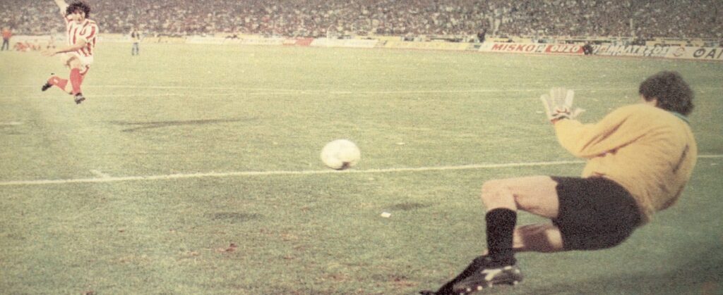Ο Παναθηναϊκός και ο Ολυμπιακός αναμετρήθηκαν τον Ιούνιο του 1977 στη Λεωφόρο για τα ημιτελικά του Κυπέλλου Ελλάδας σε μονό νοκ άουτ αγώνα. Οι «Πράσινοι» του Κάζιμιρ Γκόρσκι ουσιαστικά είχαν κλειδώσει τον τίτλο του πρωταθλητή στην Α’ Εθνική και κυνηγούσαν το νταμπλ. Το παιχνίδι είχε συγκλονιστική εξέλιξη καθώς το «Τριφύλλι» προηγήθηκε στο σκορ με τον Λιβαθηνό στο 47’, όμως στο τελευταίο λεπτό της κανονικής διάρκειας ο Γκλέζος ισοφάρισε (1-1) στέλνοντας το ματς στην παράταση. Εκεί ο Μήτσος Δημητρίου με έναν «κεραυνό» από τα 30 μέτρα (!) εκτέλεσε τον Κελεσίδη στο 103’, διαμόρφωσε το 2-1 και χάρισε στον Παναθηναϊκό μια σπουδαία πρόκριση στο δρόμο προς την κατάκτηση του νταμπλ.