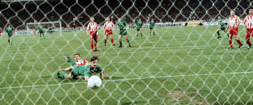 Τι ποδοσφαιρική μαγεία ήταν αυτή! Σε μια χρονιά που ο Παναθηναϊκός του Πιετρ Πάκερτ ήταν άπαιχτος, το φινάλε ήταν μεγαλειώδες. Το «Τριφύλλι» συνάντησε τον Ολυμπιακό στον τελικό του Κυπέλλου, που έγινε στο κατάμεστο ΟΑΚΑ, και αυτό που επακολούθησε ήταν μοναδικό! Οι Πράσινοι ήταν ισοπεδωτικοί απ’ το πρώτο μέχρι και το τελευταίο λεπτό σε μια απ’ τις καλύτερες παραστάσεις που έχουν γίνει ποτέ σε ποδοσφαιρικό γήπεδο της χώρας. Το «Τριφύλλι» πήρε προβάδισμα στο σκορ στο 24’ με γκολ του Βλάχου και το 1-0 διατηρήθηκε μέχρι το φινάλε του ημιχρόνου. Από εκεί και πέρα, ακολούθησε… σόου του Παναθηναϊκού: στο 52’ ο Χρήστος Δημόπουλος έγραψε το 2-0, στο 57’ το 3-0 ήταν έργο Σαραβάκου, ο οποίος διαμόρφωσε και το 4-0 στο 72’. Ο Αρβανίτης απέκρουσε το πέναλτι του «μικρού», που όμως πήρε το ριμπάουντ, «χόρεψε» την άμυνα του Ολυμπιακού και εκτέλεσε άψογα.
