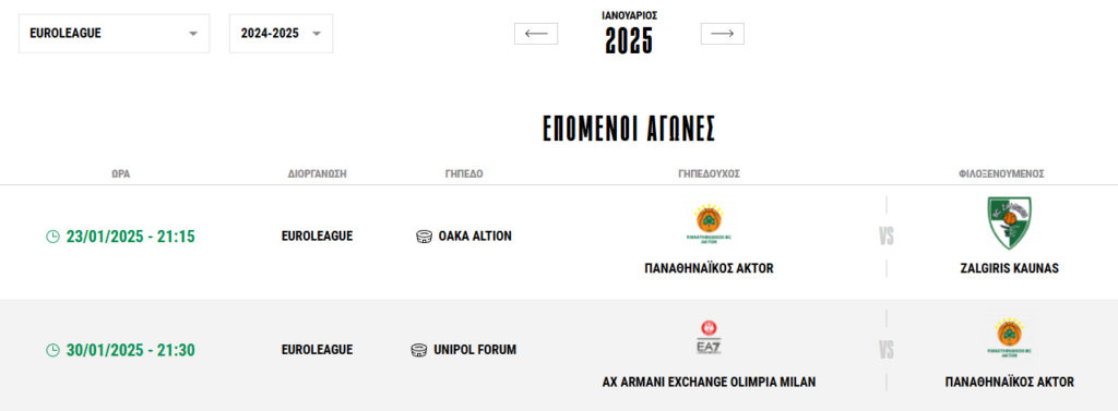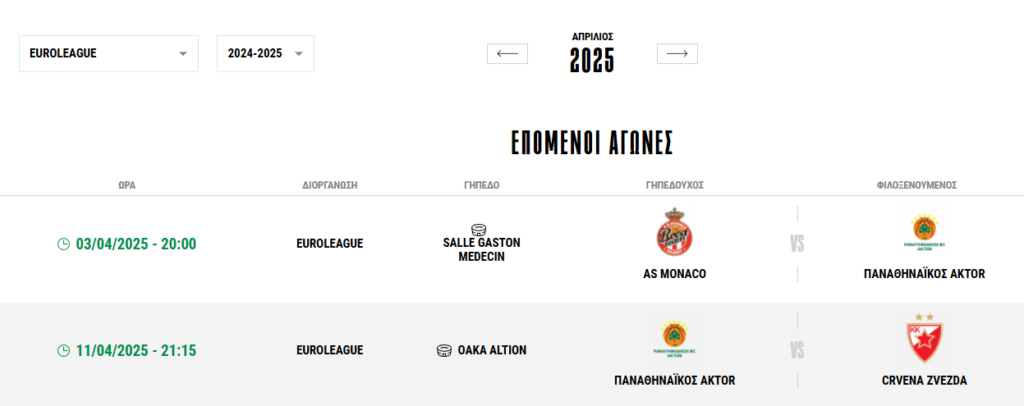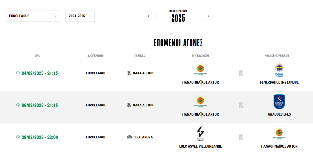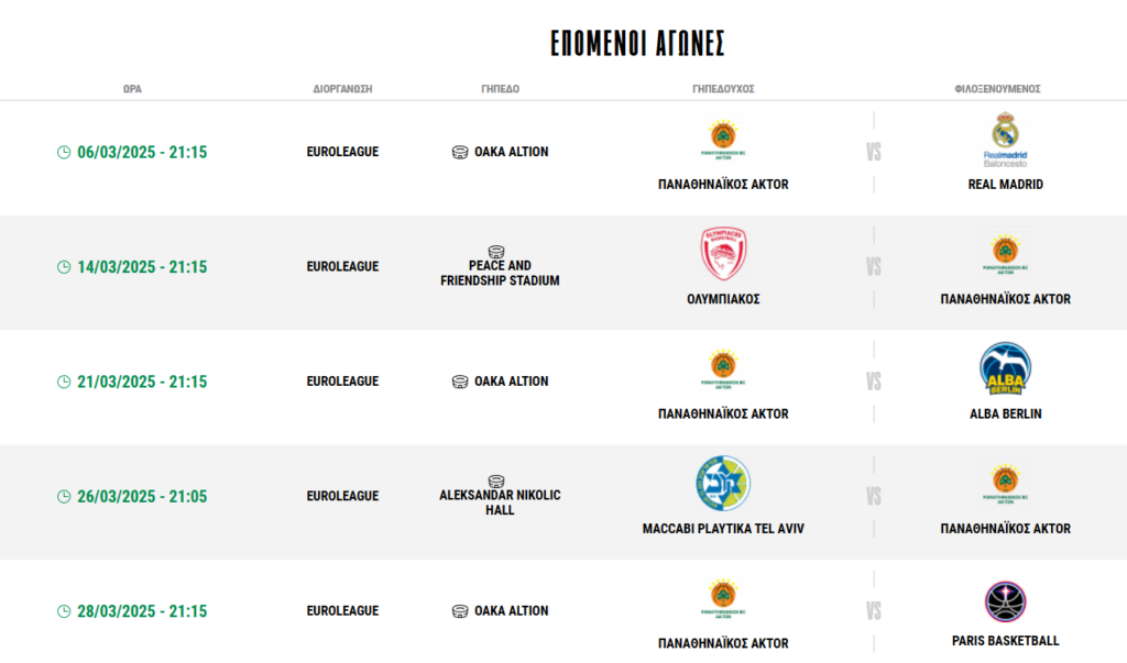 ● Εντός (7): Ζαλγκιρις, Φενέρ & Εφές (διπλή αγωνιστική), Ρεάλ Μαδρίτης, Άλμπα, Παρί, Ερυθρός Αστέρας