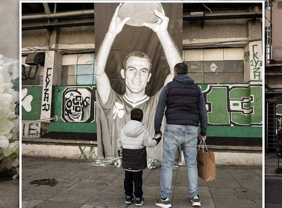 Ανάμεσα στις εικόνες που ξεχωρίζουν, μια ιδιαίτερα συγκινητική στιγμή απαθανατίζει έναν πατέρα να στέκεται με το μικρό του γιο μπροστά από το λάβαρο, αποδίδοντας σιωπηλά τον δικό του σεβασμό στον κορυφαίο ποδοσφαιριστή που φόρεσε ποτέ τη φανέλα με το «Τριφύλλι».