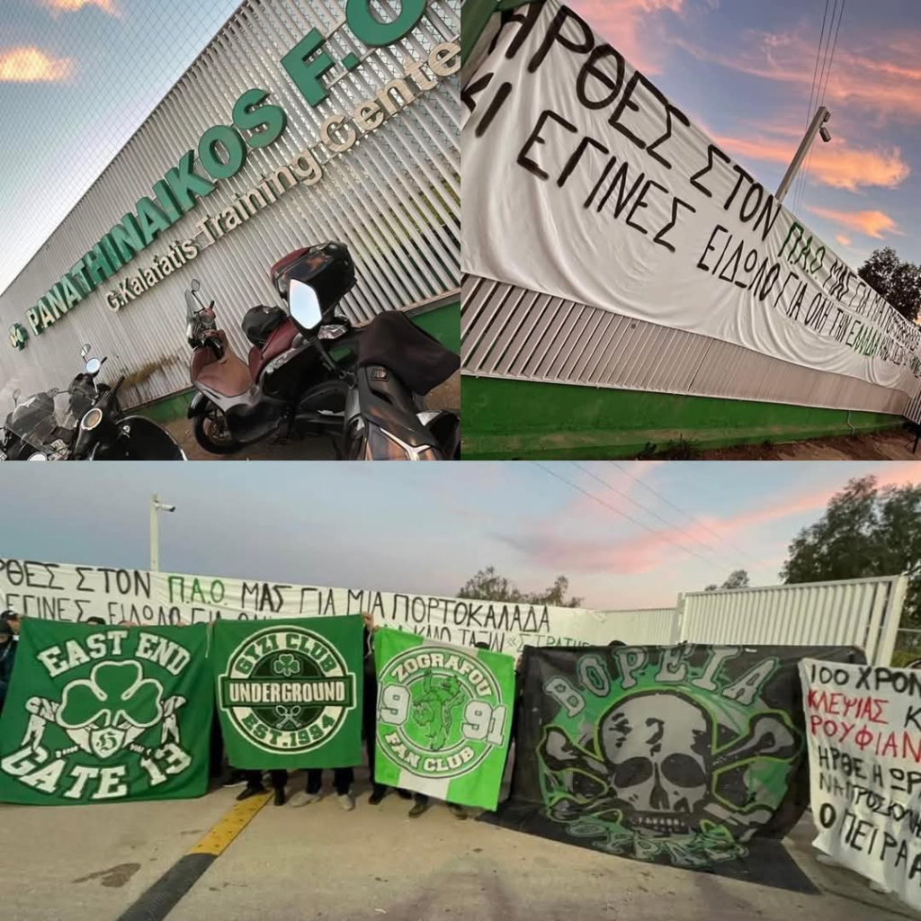 Οι φίλοι του Παναθηναϊκού που βρέθηκαν στο Κορωπί για να εμψυχώσουν την ομάδα πριν το ντέρμπι με τον Ολυμπιακό και σήκωσαν πανό στη μνήμη του Μίμη Δομάζου