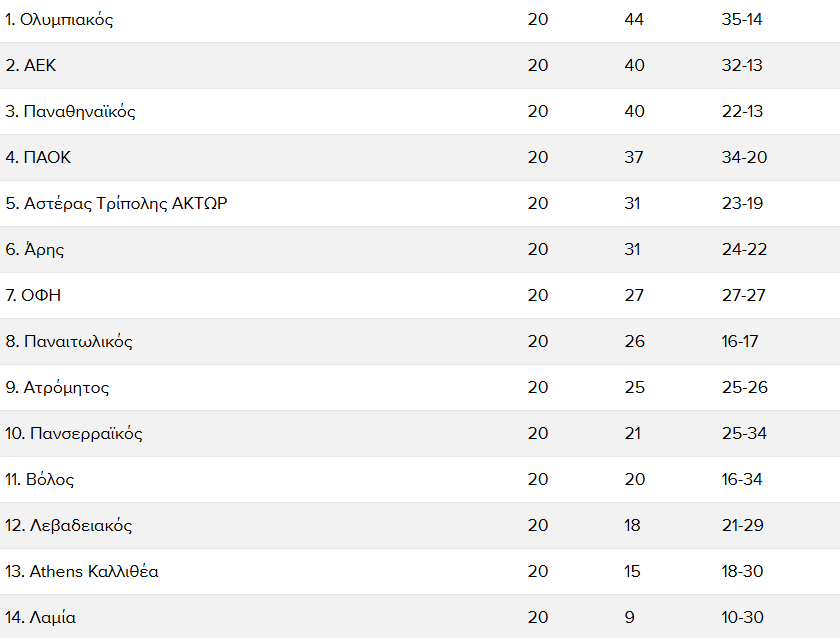 Αναλυτικά η βαθμολογία της Super League μετά τους αγώνες για την 20ή αγωνιστική έχει ως εξής: