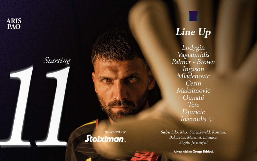 Ο Ρουί Βιτόρια παρατάσσει τον Παναθηναϊκό στο Κλεάνθης Βικελίδης απέναντι στον Άρη με τον Λοντίγκιν κάτω από τα δοκάρια (ο Ντραγκόφσκι αντιμετωπίζει πρόβλημα στη μέση) και τους Βαγιαννίδη, Πάλμερ, Ίνγκασον και Μλαντένοβιτς μπροστά του.