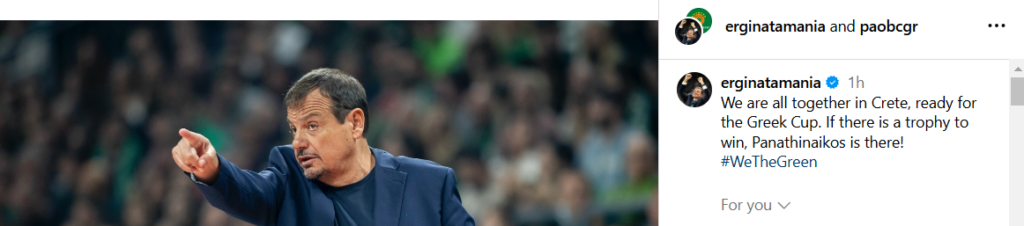«Είμαστε όλοι μαζί στην Κρήτη, έτοιμοι για το Κύπελλο Ελλάδας. Εάν υπάρχει κάποιο τρόπαιο, τότε ο Παναθηναϊκός είναι εκεί» ανέφερε χαρακτηριστικά στην ανάρτηση που έκανε στο Instagram.