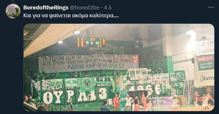 Στο ματς του Παναθηναϊκού με τον Πανσερραϊκό για το μπάσκετ γυναικών, η Θύρα 13 σήκωσε πανό για τα Τέμπη και τον Άδωνι, ο οποίος έχει στείλει στα κάγκελα την πλειοψηφία της ελληνικής κοινωνίας με τα όσα εξοργιστικά ξεστομίζει το τελευταίο διάστημα για αυτό το κορυφαίο θέμα.