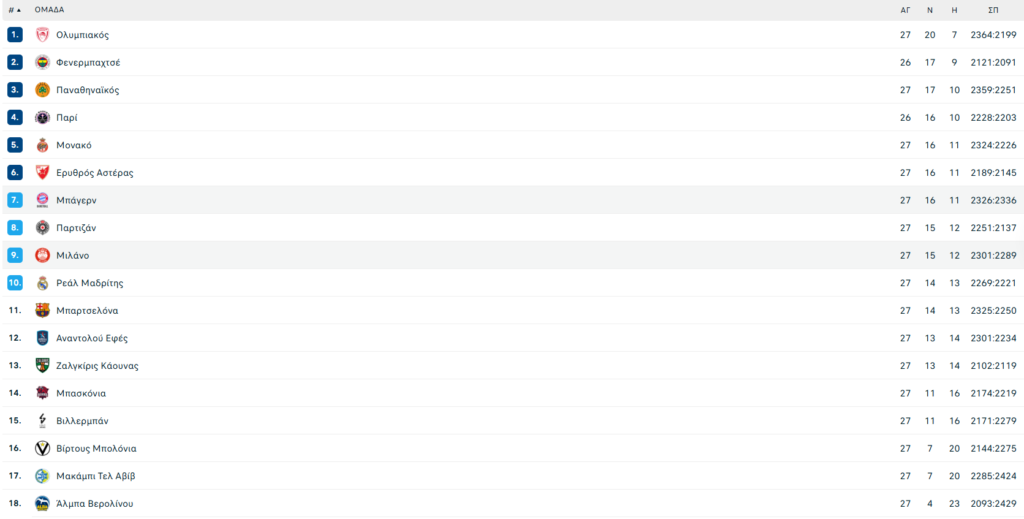 Ο Παναθηναϊκός φιγουράρει στην τρίτη θέση της βαθμολογίας της Euroleague με ρεκόρ 17-10 μετά τα ευνοϊκά αποτελέσματα για τους Πρωταθλητές Ευρώπης στα υπόλοιπα ματς της 27ης αγωνιστικής.