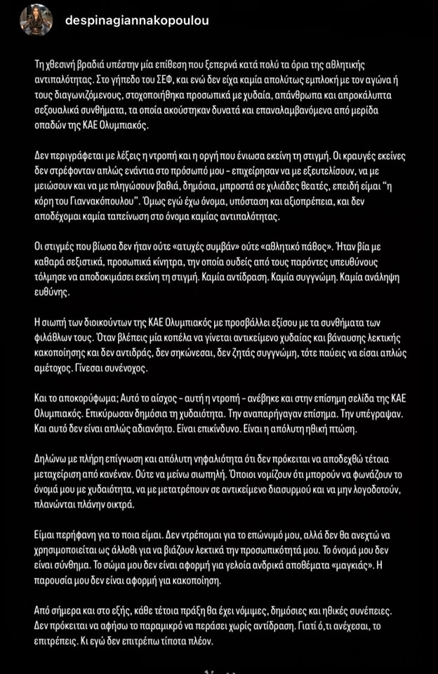 Η Δέσποινα Γιαννακοπούλου πήρε θέση για τα εμετικά συνθήματα που την αφορούσαν και έκανε λόγο για βία με σεξιστικά και προσωπικά κίνητρα αναφέροντας χαρακτηριστικά τα εξής: