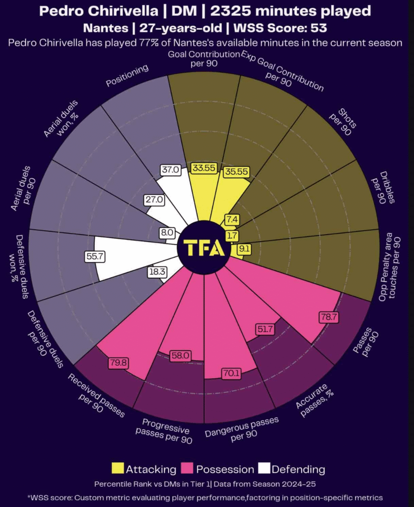 Ο Chirivella λατρεύει να απλώνει το παιχνίδι σε όλο το γήπεδο και διαθέτει μεγάλο εύρος πάσας, κάνοντας περισσότερες μακρινές πάσες (7,89 ανά 90 λεπτά) από οποιονδήποτε άλλο αμυντικό μέσο με τουλάχιστον 800 λεπτά συμμετοχής στην κορυφαία κατηγορία της Γαλλίας αυτή τη σεζόν.