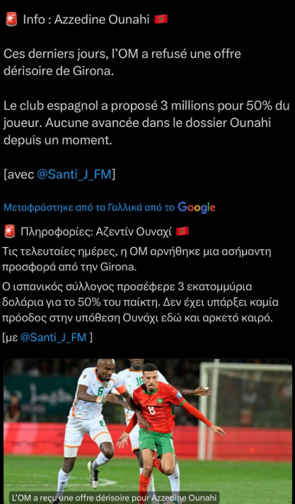 Παράλληλα, τονίζει πως οι Μασσαλοί συνεχίζουν να ζητούν 12 εκατ. ευρώ για να παραχωρήσουν τον παίκτη.