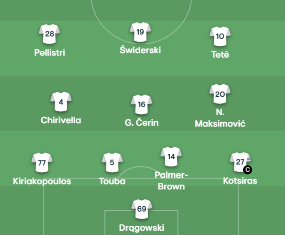 Στα χαφ θα είναι οι Τσιριβέγια, Μαξίμοβιτς, Τσέριν και επιθετική τριπλέτα οι Πελίστρι, Τετέ και Σβιντέρσκι.