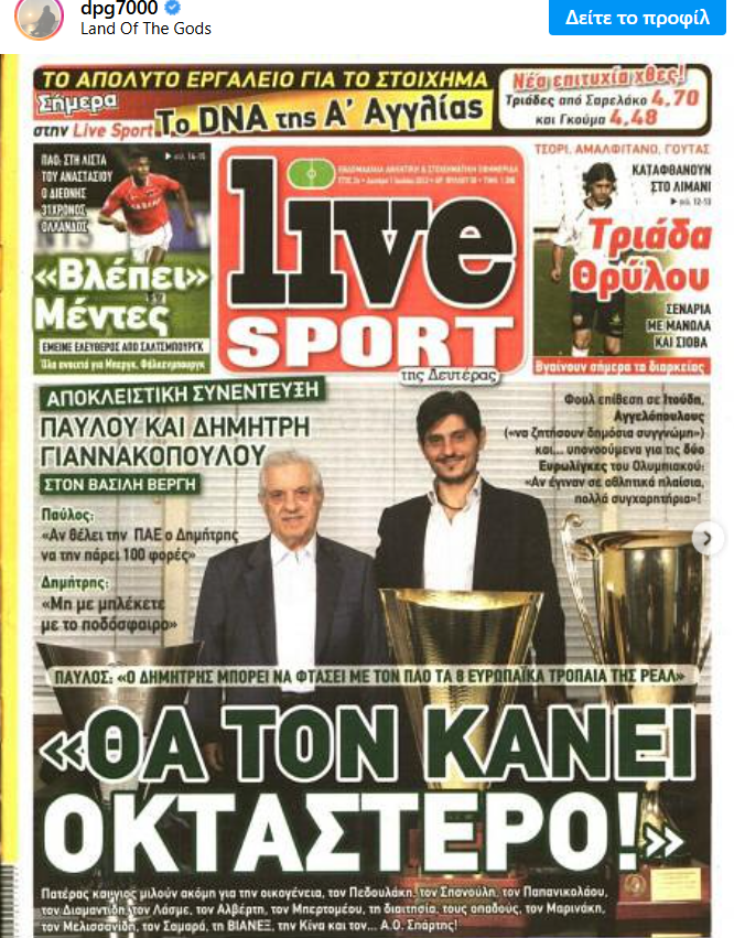 Μέσα από τα social media, ανέβασε το εξώφυλλο παλαιότερης συνέντευξής του μαζί με τον Παύλο Γιαννακόπουλο στην εφημερίδα «Live Sport», στο οποίο κυριαρχεί η φράση: «Θα τον κάνει οκτάστερο».